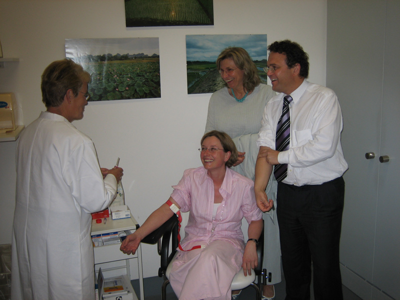 Die drei oberfränkischen Bundestagestagsabgeordneten Petra Ernstberger (SPD), Dr. Hans-Peter Friedrich (CSU) und Elisabeth Scharfenberg (Bündnis 90/Die Grünen)anlässlich eines gemeinsamen Termins zur Blutabnahme für eine Typisierung im Rahmen der Spenden- und Typisierungsaktion "Leukämie - es kann jeden treffen. Hilfe für Carolin, Helga und viele andere" aus Selb bei der Parlamentsärztin Frau Dr. Wahlen am 18.05.06.