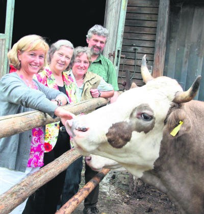 Auf dem Bioland-Hof von Bernd und Gerti Röder (von rechts) in Pilgramsreuth informierten sich Bärbel Höhn, Grünen-Fraktionsvize im Bundestag, und die örtliche grüne Abgeordnete Elisabeth Scharfenberg (links) über die gentechnikfreie Landwirtschaft. Foto: R. M. - aus dem Artikel der Frankenpost vom 07.07.09