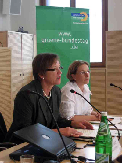 Pressefoto: Irmingard Schewe-Gerigk (links), frauenpolitische Sprecherin von Bündnis 90/ Die Grünen und Elisabeth Scharfenberg (rechts), pflegepolitische Sprecherin, beim Vortrag