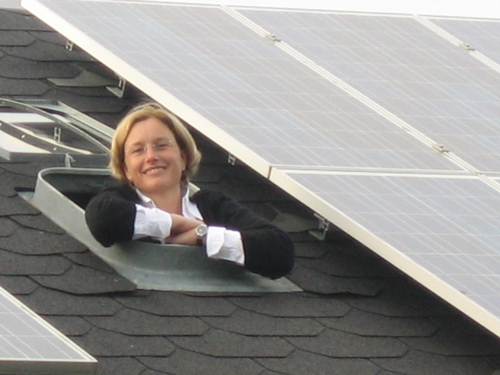 Die Bundestagsabgeordnete Elisabeth Scharfenberg mit der neuen Fotovoltaik-Anlage auf dem Dach Ihres Hauses in Rehau.