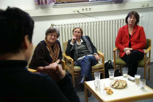 Elisabeth Scharfenberg unterhält sich gemeinsam mit MdL Maria Scharfenberg (rechts) und Bezirksrätin Ingeborg Huber (links) mit einer betroffenen Methadon-Patientin