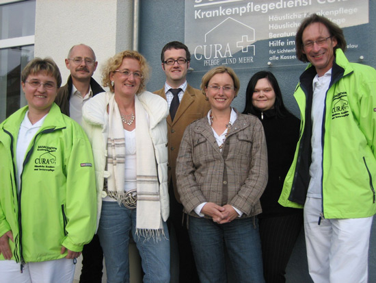 MdB Scharfenberg (3.v.re.) vor den Geschäftsräumen von "Cura".Von links nach rechts: Mitarbeiterin bei "Cura" Karin Burkheiser, Grünen-Stadtrat Bernhard Christoph, Verwaltungsleiterin bei "Cura" Doris Kleiner, Partik Ruh, Geschäftsführer des ABVP (Arbeitgeber und Berufsverband privater Pflege e.V.) und Klaus Kleiner, Pflegedienstleister von "Cura".Hintergrund: Positionspapier "Pflege menschenwürdig gestalten" unter: http://www.gruene-bundestag.de/cms/beschluesse/dokbin/148/148183.pdf